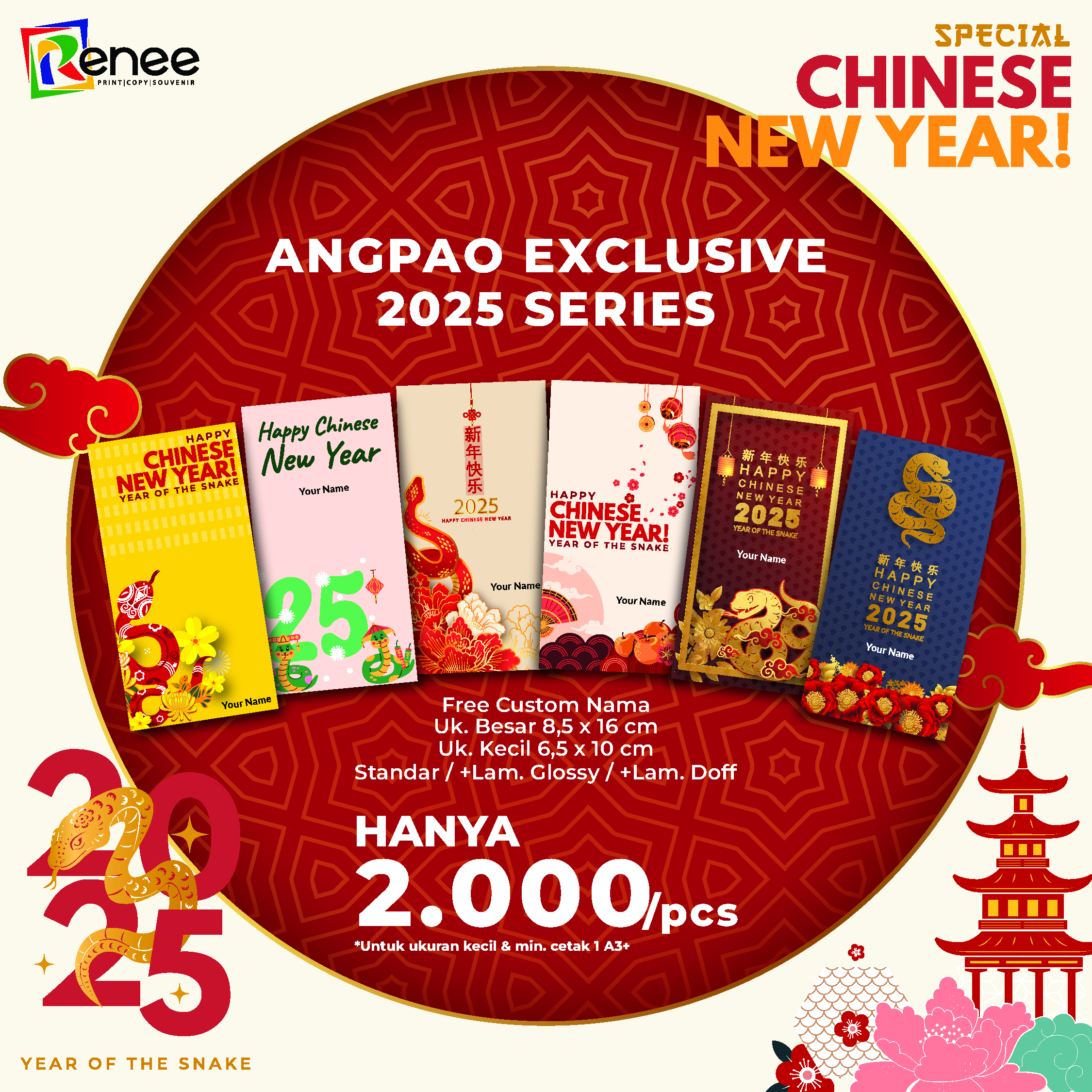 Perayaan Imlek tidak lengkap tanpa angpao! Angpao kami hadir dengan desain yang elegan dan penuh makna, siap membawa keberuntungan dan kebahagiaan kepada orang-orang tercinta. Setiap angpao dibuat dengan bahan berkualitas tinggi dan detail yang memukau, mencerminkan tradisi dan kemewahan.